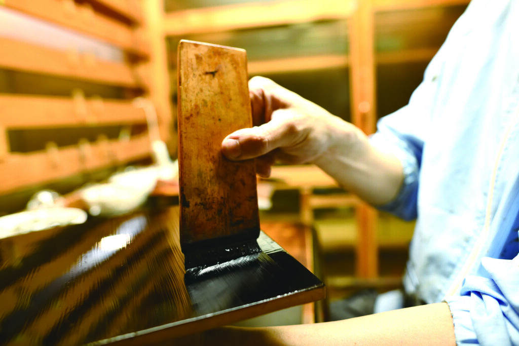 金沢仏壇の塗師は、上塗りした部分に「箔押し(別パネル⑨参照)」もします。