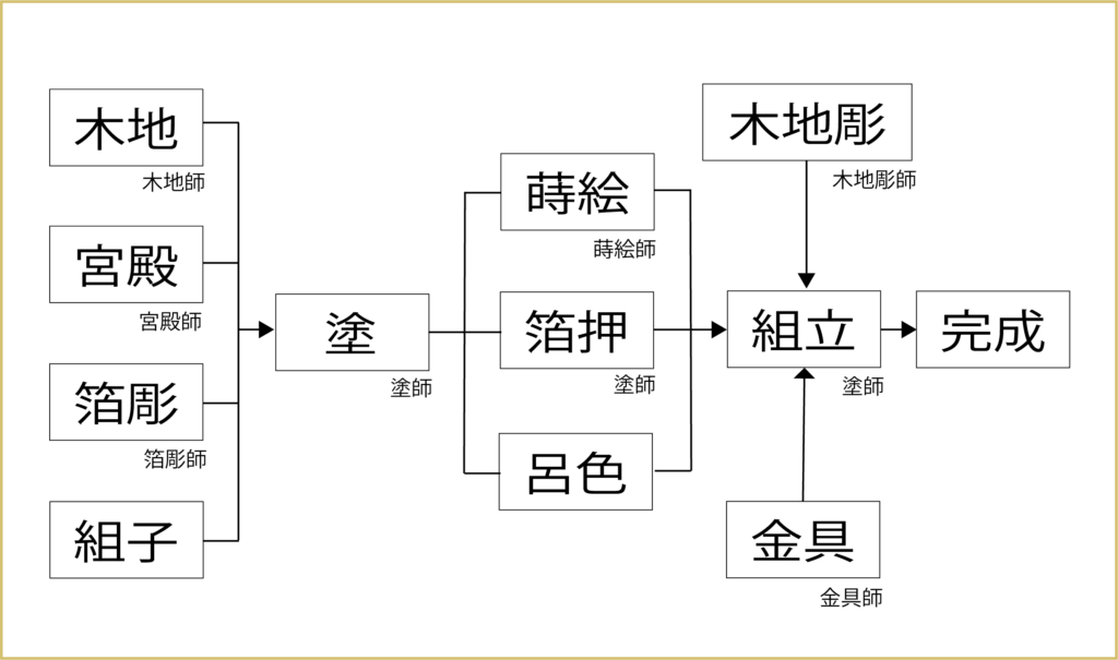 金沢仏壇は、七つの専門工程「七職」によって作られます。